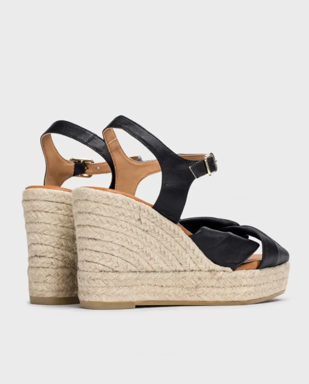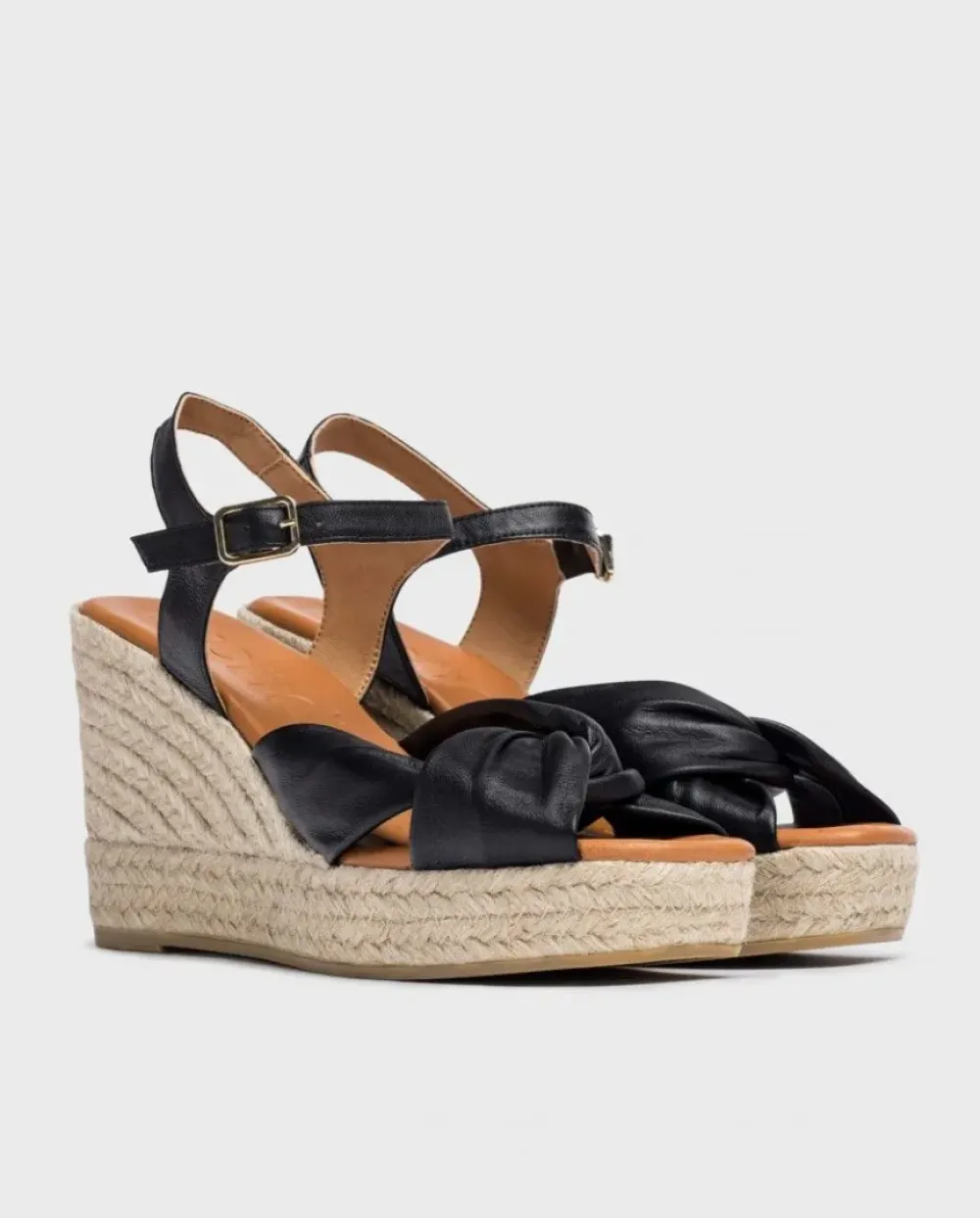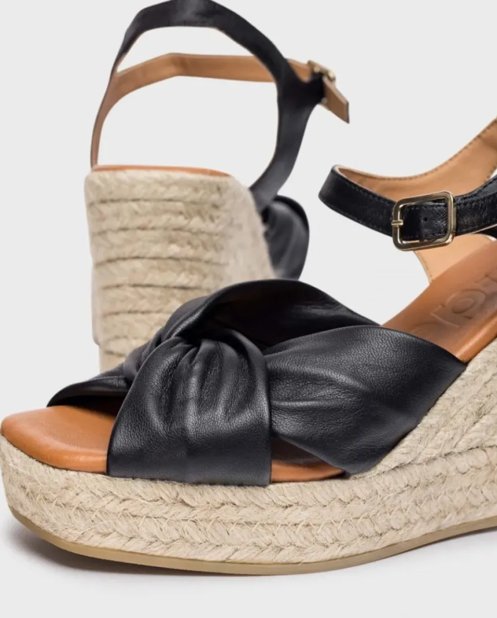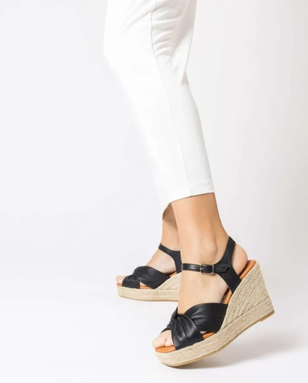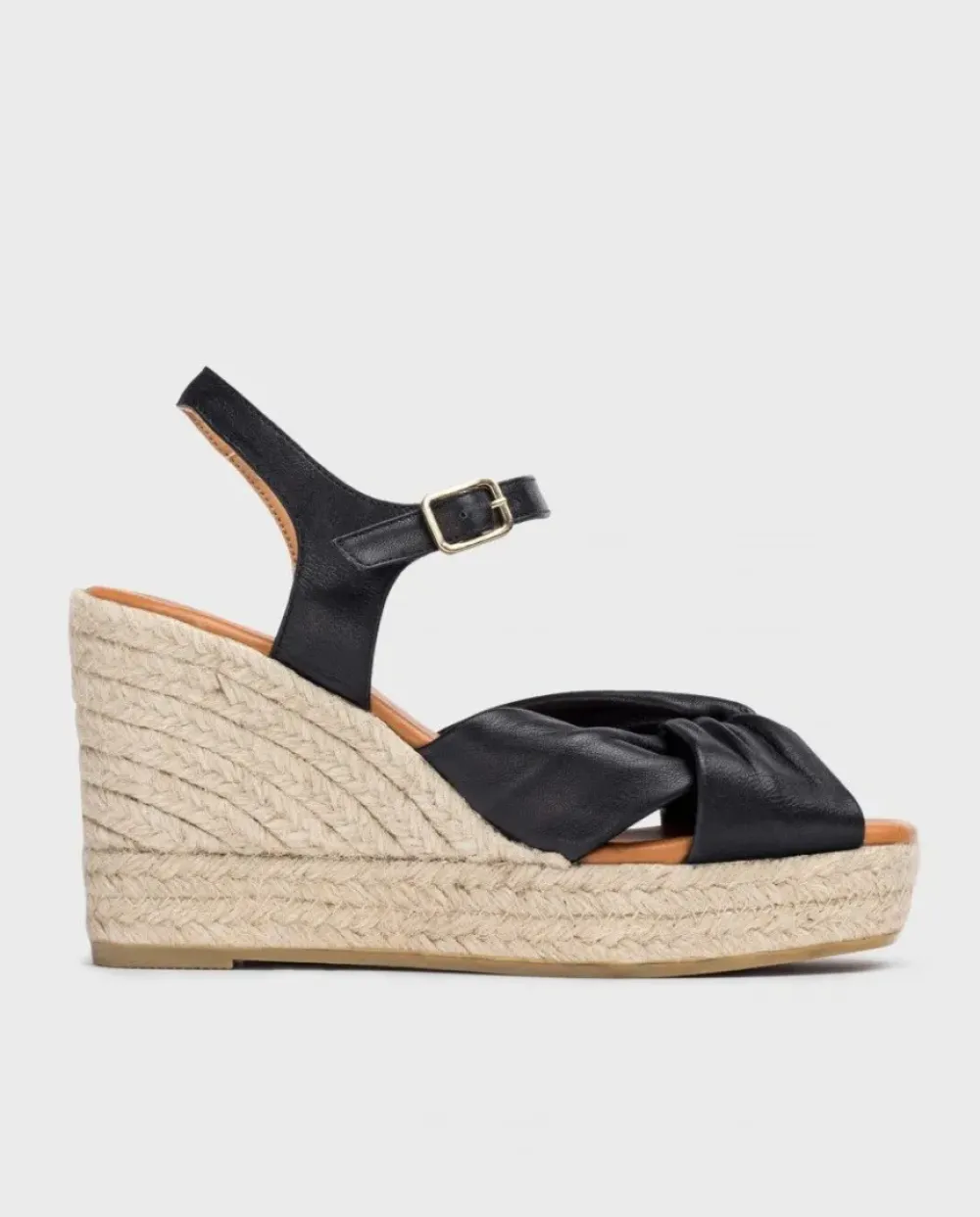 Alpargatas Con Cuña De Yute Trenzado Elaborada En Piel De Color Negro. Sujección En Forma De Lazo Al Empeine. Cierre De Pulsera Con Hebilla Ajustable. Fabricadas En España Con Materiales Sostenibles, La Fibra De Yute Es 100% Biodegradable Y Reciclable, Inocuo Para El Medio Ambiente. Un Modelo Ideal Para Tus Looks De Verano.