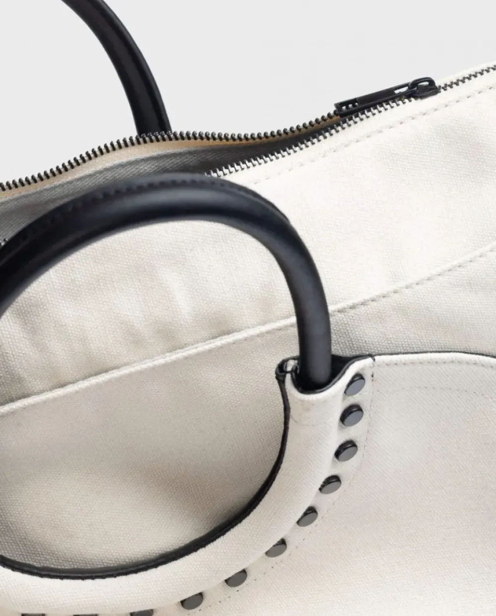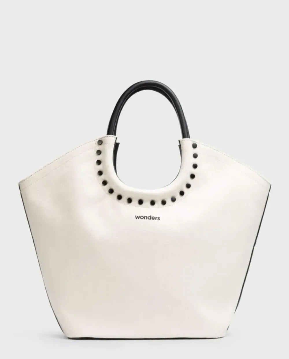 Bolso Shopper Fabricado En Algodón Combinado En Dos Colores Blanco/Negro . Un Modelo De Tamaño Grande Con Asa De Mano, Y Adorno De Remaches Con Serigrafía De Marca. Contiene Un Compartimento Interior Extraíble Con Bolsillos Laterales Y Cierre Con Cremallera. Cierre Central Con Botón Igmantado. Tamaño 34X51X3Cm