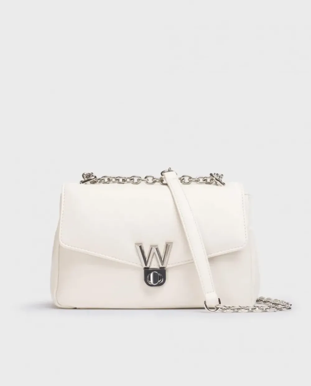 Bolso Bandolera En Color Blanco Nacarado. Un Modelo Elegante De Tamaño Mediano Con Detalle De Logotipo Metalizado En La Solapa. Asa Larga De Cadena Metalizada. Interior Con Tres Compartimentos Y Dos Bolsillos Con Cierre De Cremallera. Un Complemento Perfecto Para Tus Zapatos Wonders. Tamaño 26X17X9,5 Cm.
