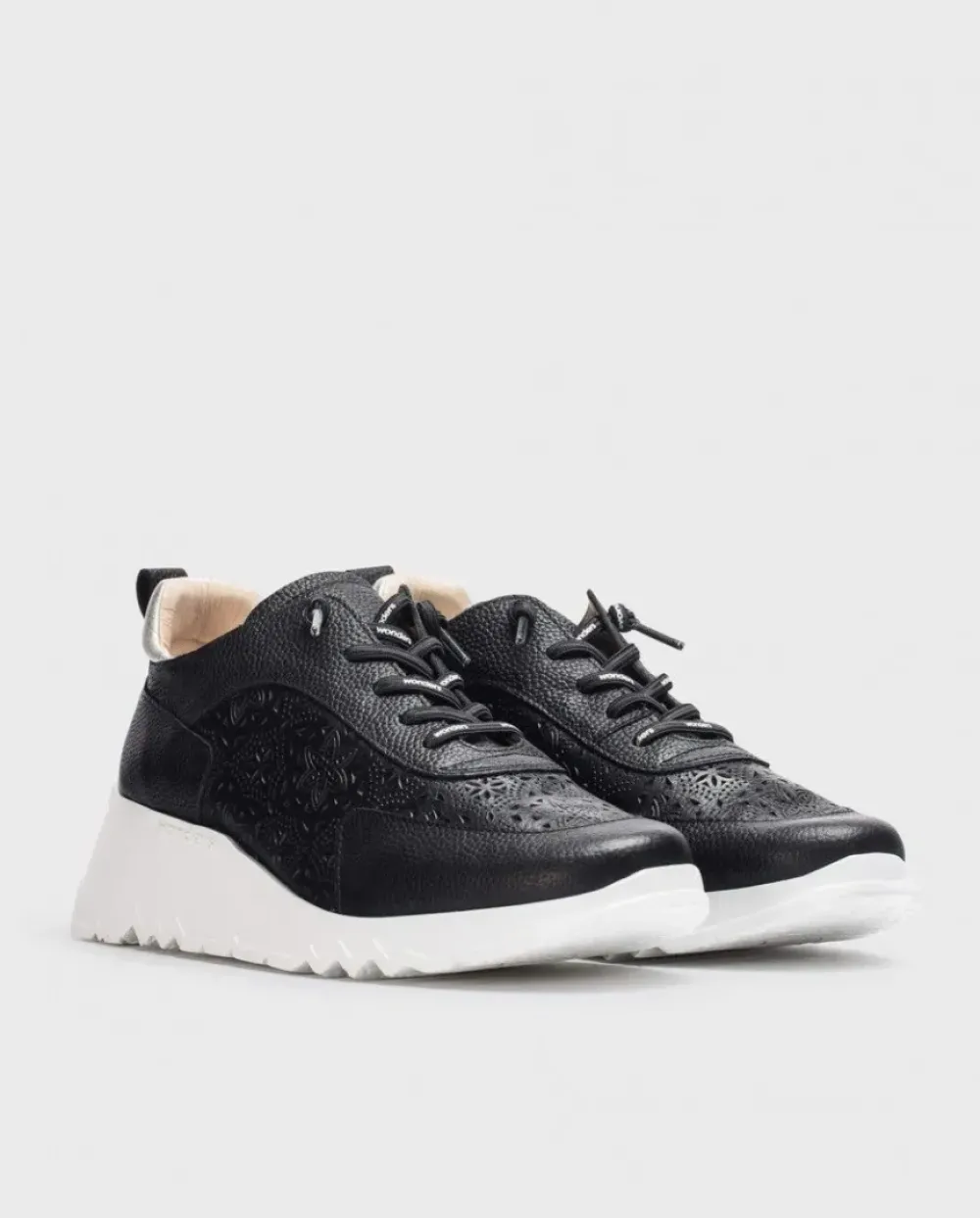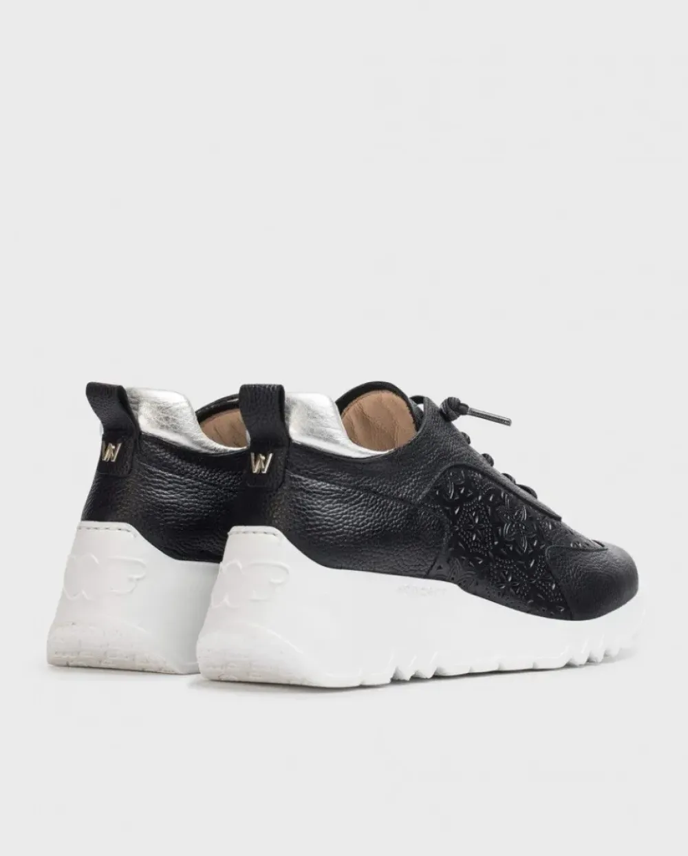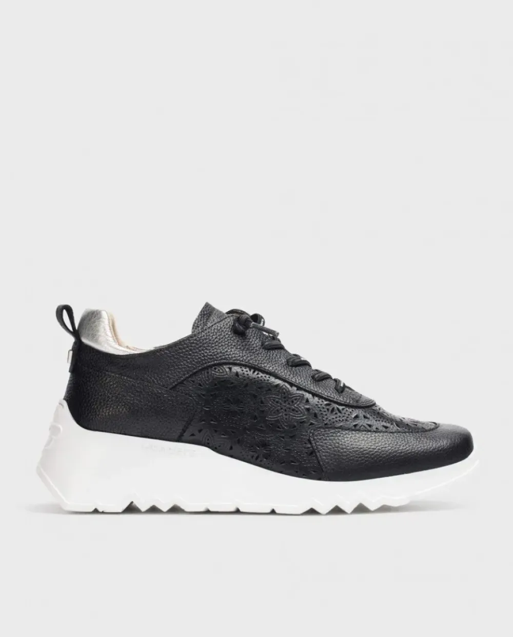 Deportivas De Piel Texturizada En Color Negro. Un Modelo Sport Con Detalle De Perforado Con Dibujo Floral. Parte Trasera Acolchada En Color Plata. Cierre Mediante Cordones Elásticos Logotipados. Suela Dentada Desarrollada Con Tecnología Wondersfly ™ Garantía De Ligereza Y Confort . Prepárate Para La Sensación, Yes We Fly.