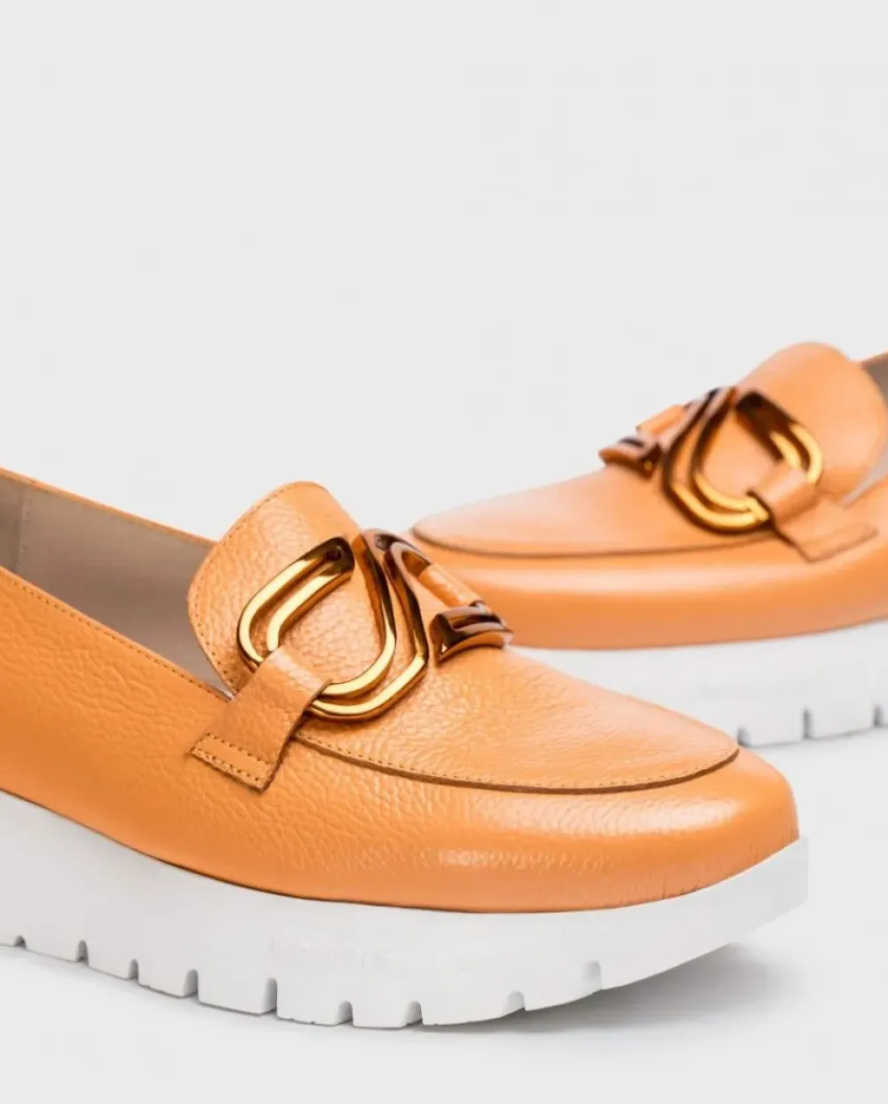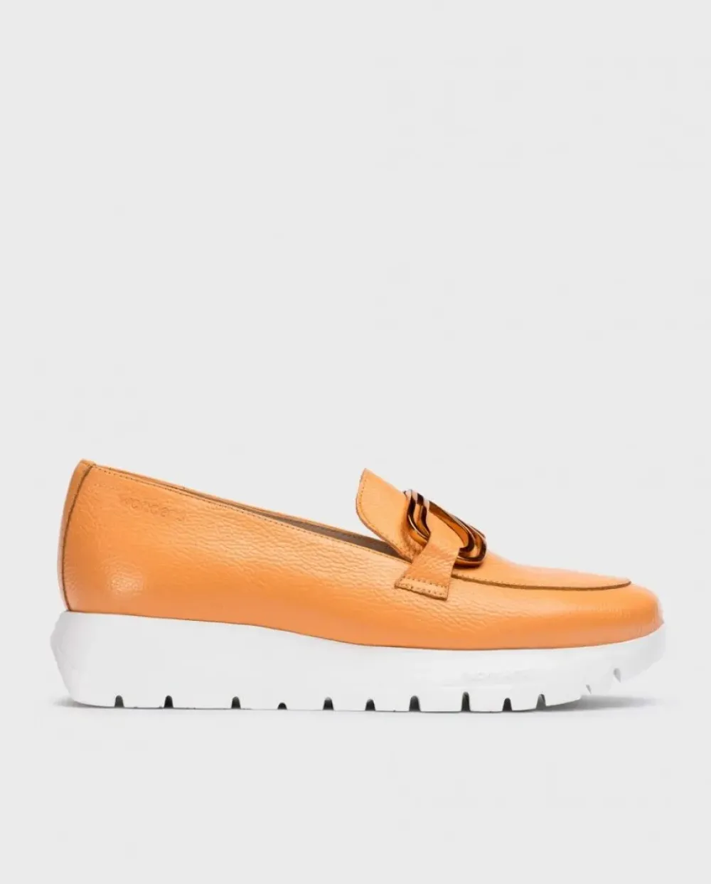Mocasin En Piel Texturizada En Color Naranja. Modelo Clásico Y Atemporal Con Punta Redondeada, Detalle Frontal En Forma De Cadena Metalizada Y Plantilla Extraible. Suela Dentada Desarrollada Con Tecnología Wondersfly ™ Que Aporta Una Extrema Ligereza Y Confort Al Modelo Sidney. ¡Consíguelo Ahora Para Experimentar La Moda Y La Comodidad En Cada Paso!