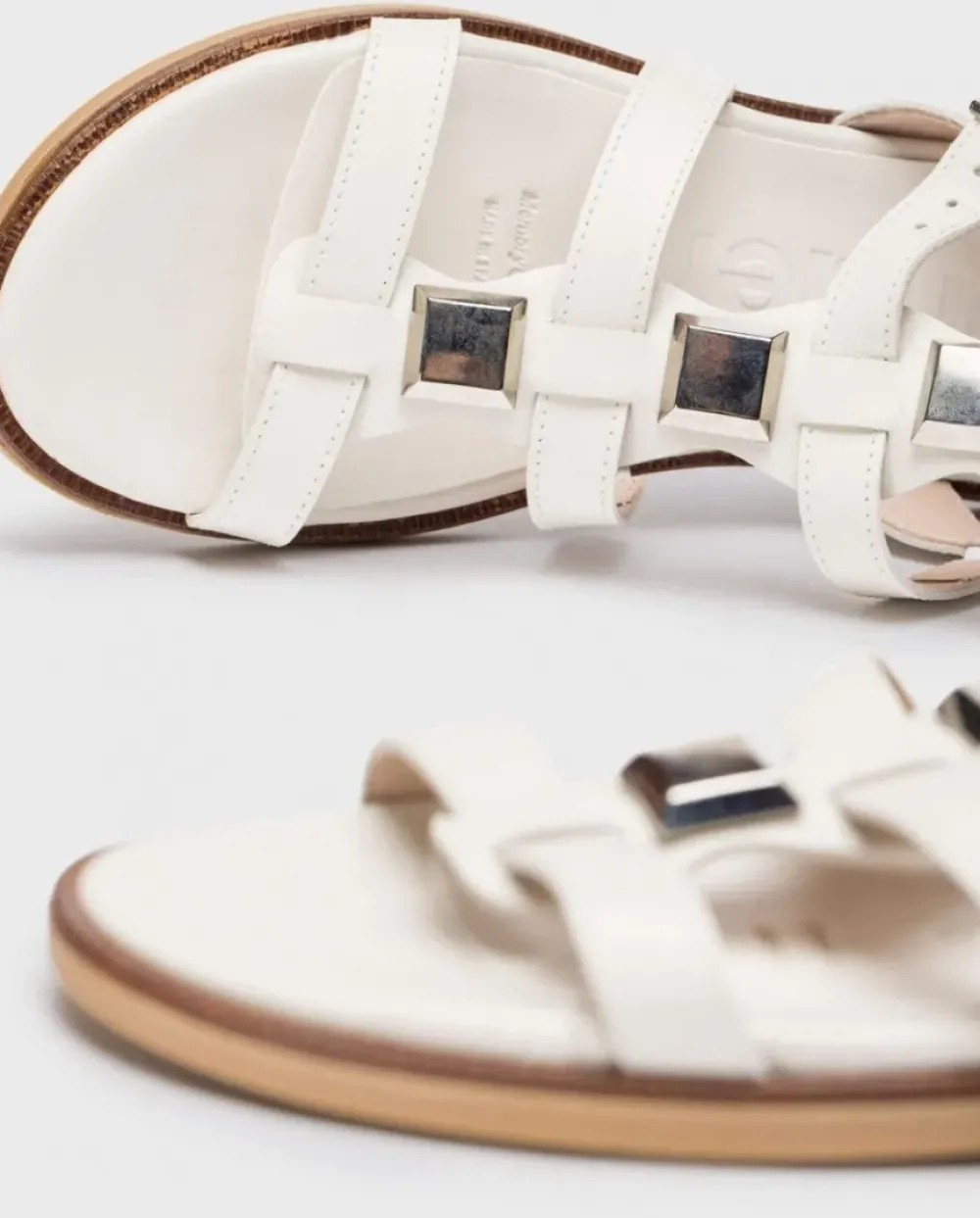 Sandalias Planas En Piel Lisa En Blanco. El Modelo Olimpia Es Un Contemporáneo Con Multi Tiras Y Detalles Metalizados Geométrcos Y Una Sujección Perfecta Gracias A Una Hebilla Que Rodea El Tobillo. Disfruta De Comodidad Garantizada Gracias A La Plantilla Memorygel. ¡Consigue Los Tuyos Y Camina Con Estilo Y Confort En Cada Paso!
