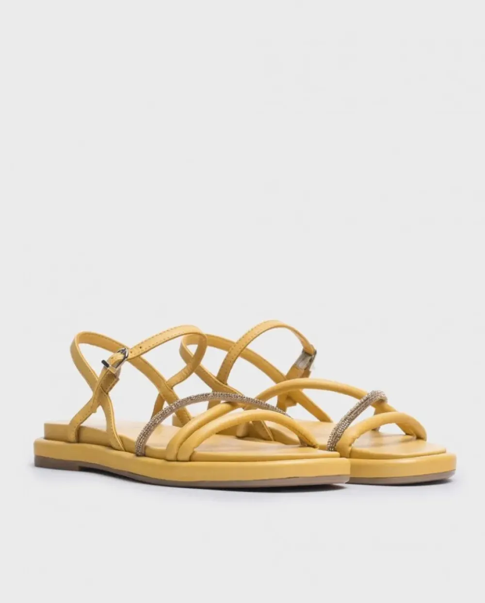Sandalia Plana Venus De Piel En Color Amarillo. Un Modelo Versátil De Tiras Delanteras Acolchadas Con Detalle De Strass Y Cierre Mediante Tira Con Cierre De Hebilla Ajustable. Suela Acolchada Que Permite Conseguir Un Calzado Cómodo Y A La Moda.