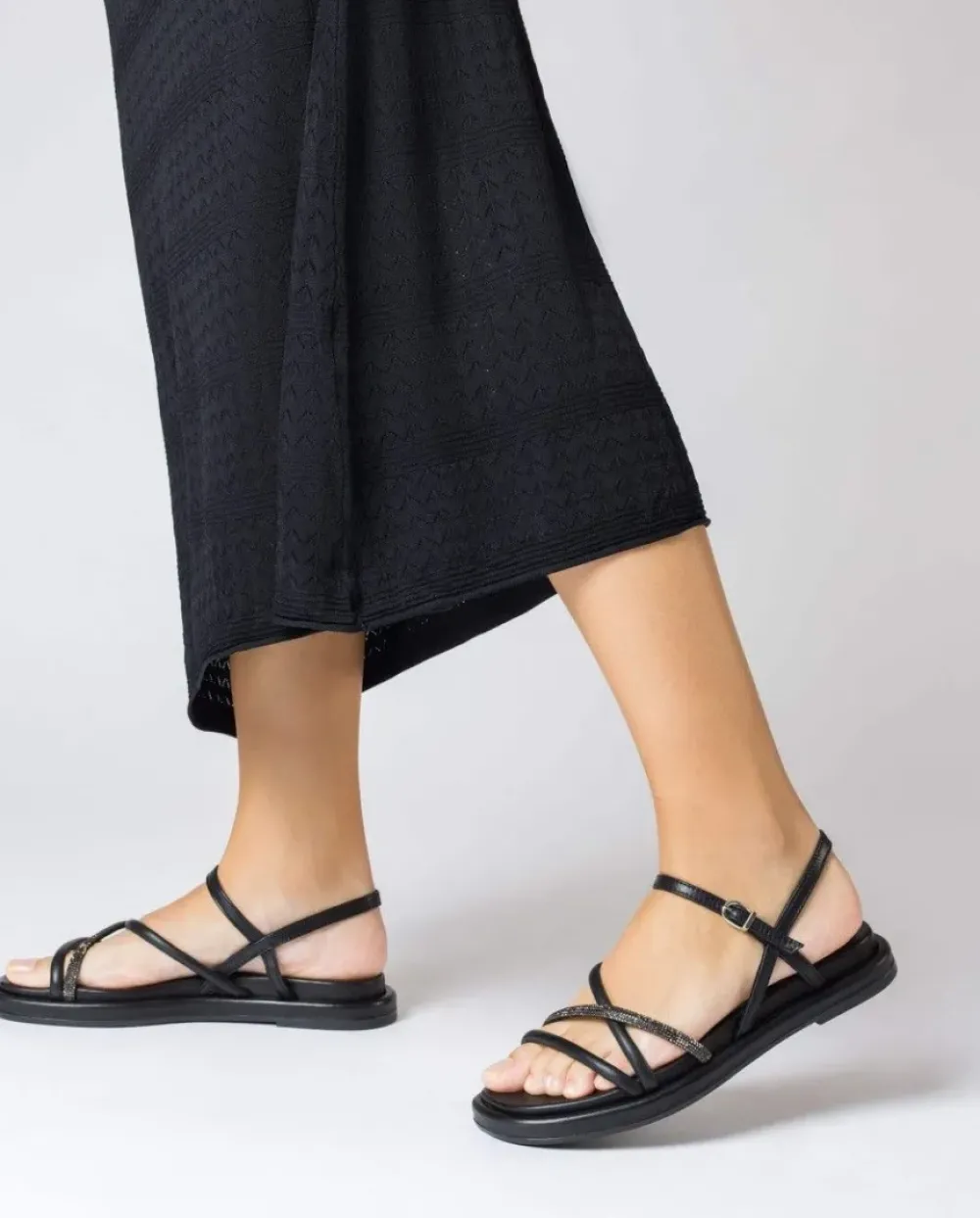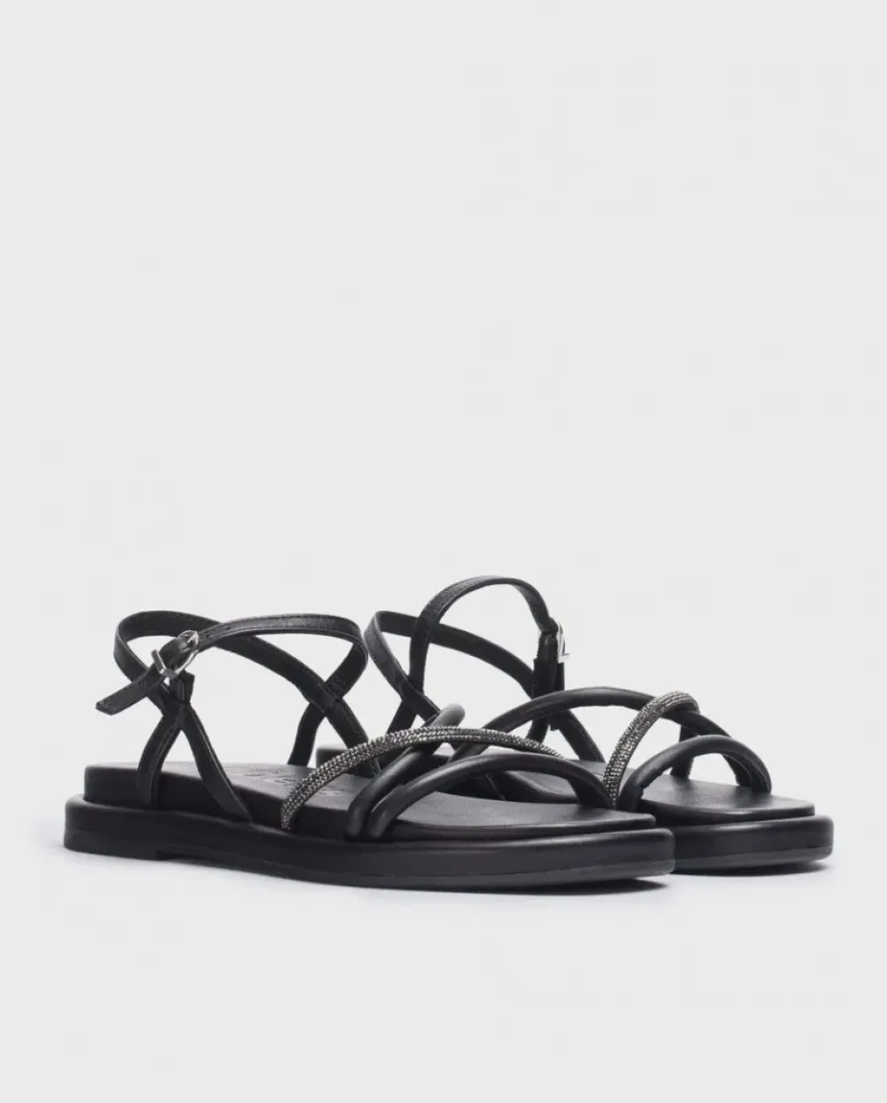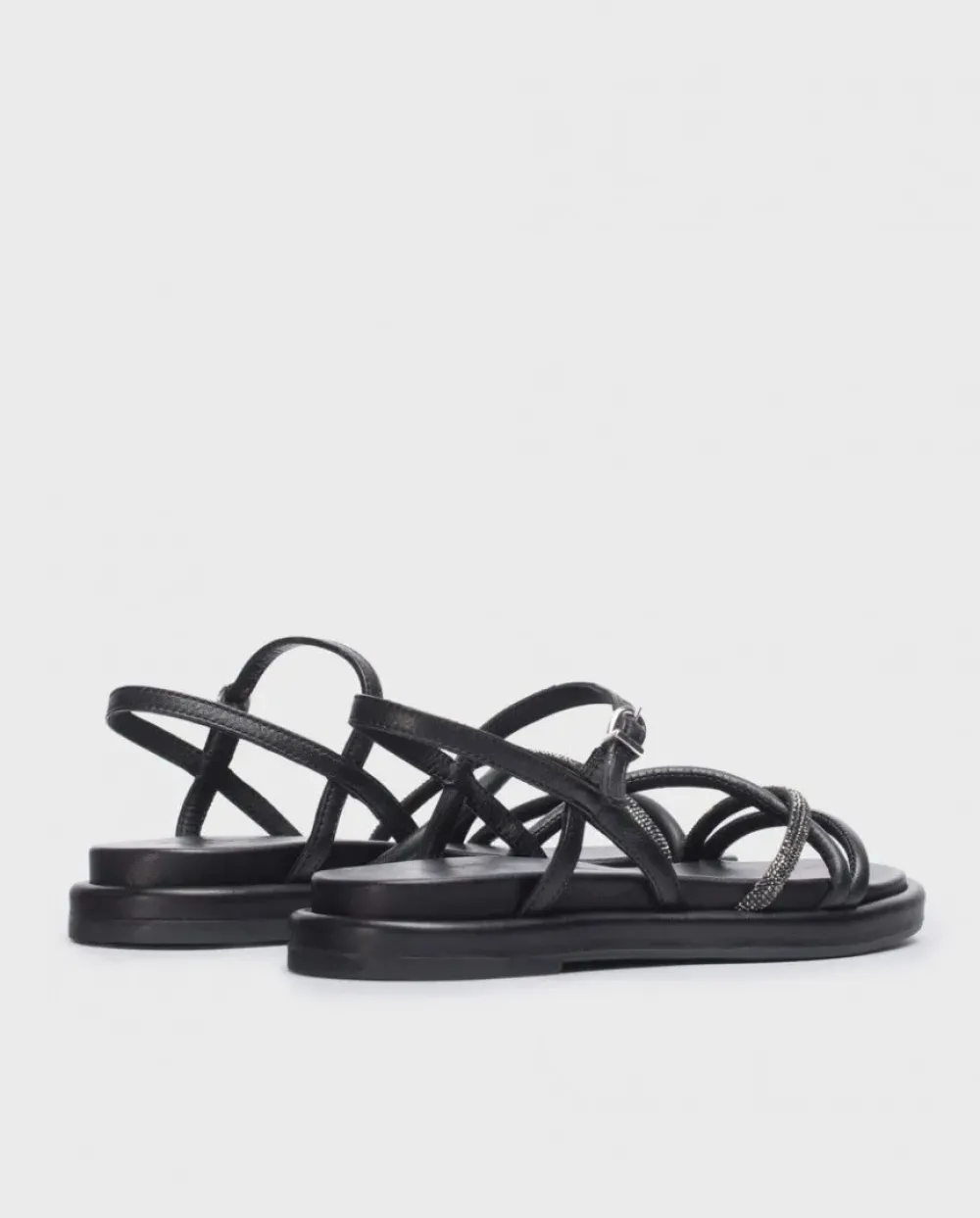 Sandalia Plana Venus De Piel En Color Negro. Un Modelo Versátil De Tiras Delanteras Acolchadas Con Detalle De Strass Y Cierre Mediante Tira Con Cierre De Hebilla Ajustable. Suela Acolchada Que Permite Conseguir Un Calzado Cómodo Y A La Moda.