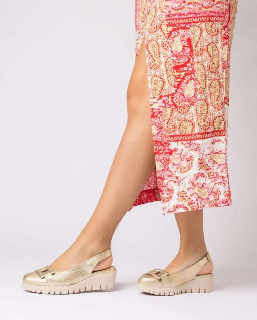 Zapato De Cuña En Piel Metalizada En Tono Platino. Modelo Vérsatil Presenta Un Adorno De Eslabón A Juego, De Punta Redonda Y Una Tira Trasera Con Elástico Interno Para Una Mejor Sujeción. Con Plantilla Memorygel Para Una Pisada Mejorada. Suela Maxi Dentada Desarrollada Con Tecnología Wondersfly ™ Garantía De Ligereza Y Confort . Prepárate Para La Sensación, Yes We Fly Con Nuestro Modelo Supra