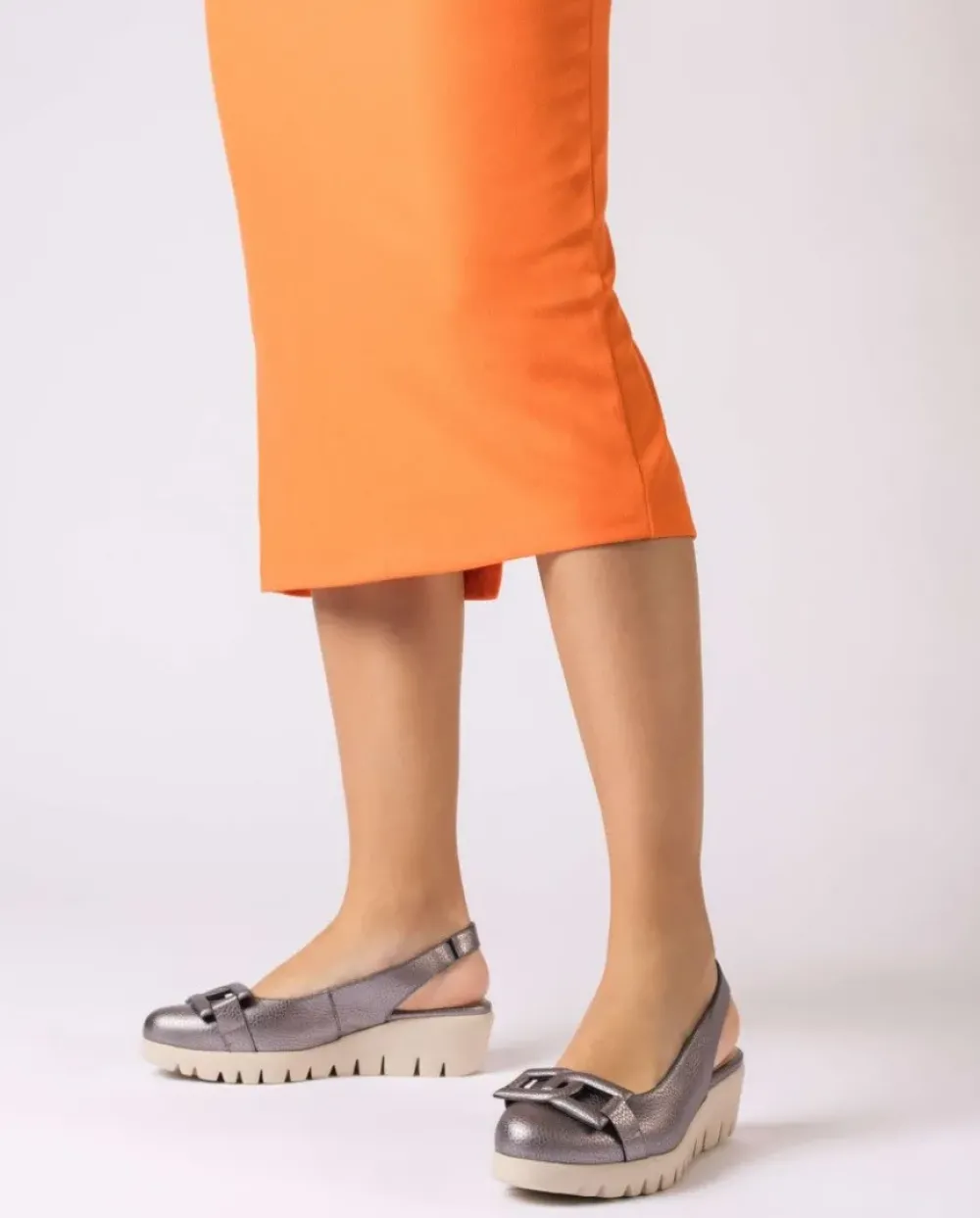Zapato De Cuña En Piel Metalizada En Tono Plomo. Modelo Vérsatil Presenta Un Adorno De Eslabón A Juego, De Punta Redonda Y Una Tira Trasera Con Elástico Interno Para Una Mejor Sujeción. Con Plantilla Memorygel Para Una Pisada Mejorada. Suela Maxi Dentada Desarrollada Con Tecnología Wondersfly ™ Garantía De Ligereza Y Confort . Prepárate Para La Sensación, Yes We Fly Con Nuestro Modelo Supra