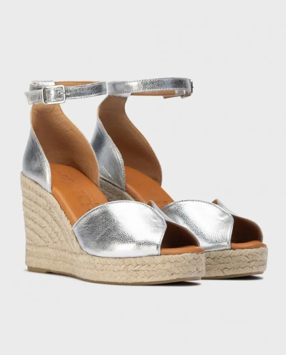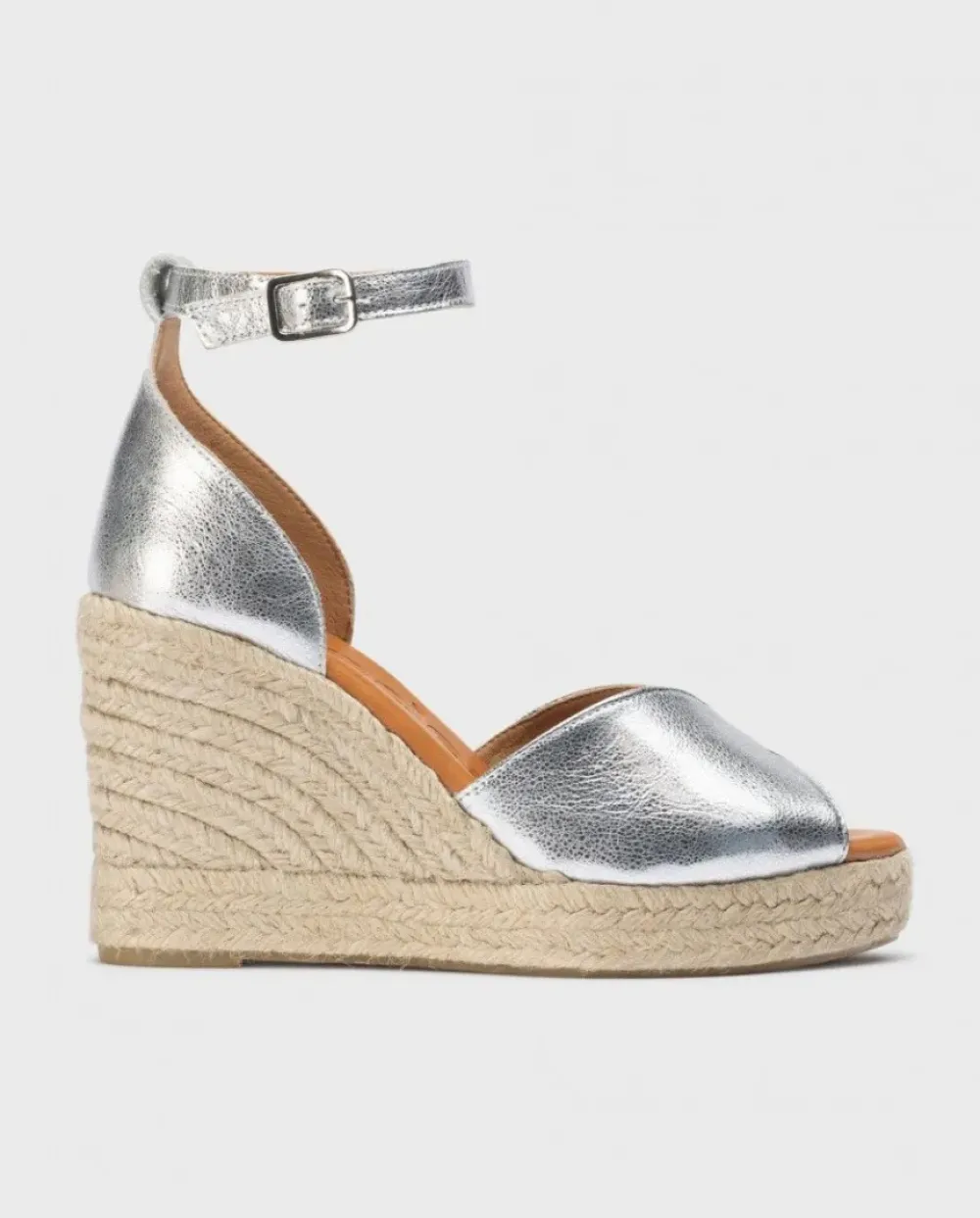 Alpargatas Con Cuña De Yute Trenzado Elaborada En Piel Metalizada Plateada. Diseño Brillante Con Detalle En Forma De Banda Al Empiene. Cierre De Pulsera Con Hebilla Ajustable Al Tobillo. Fabricadas En España Con Materiales Sostenibles, La Fibra De Yute Es 100% Biodegradable Y Reciclable, Inocuo Para El Medio Ambiente. Un Modelo Ideal Para Tus Looks De Verano.