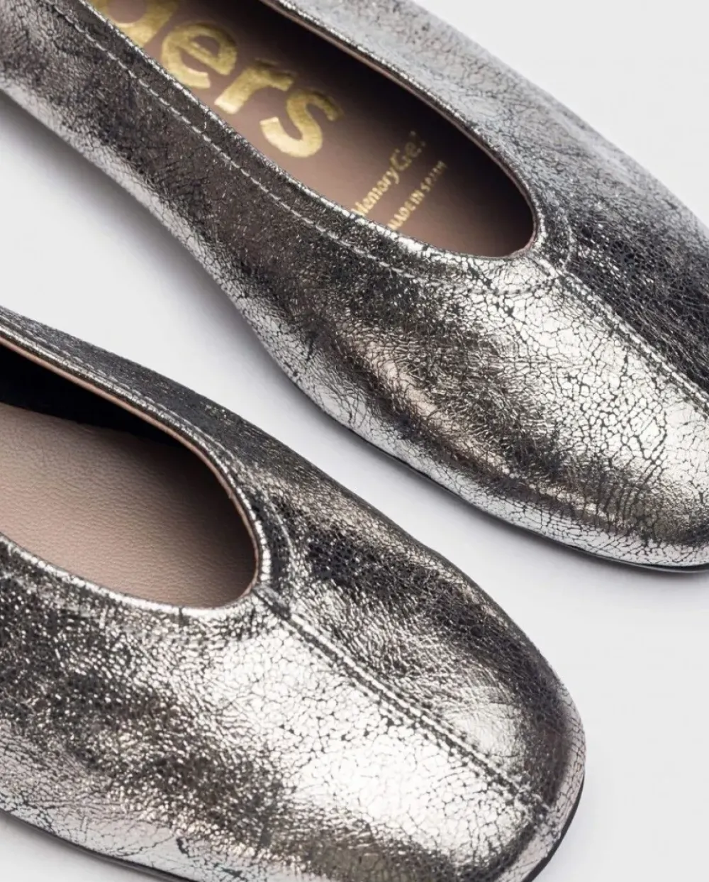 Bailarina Plana Pepa De Mujer En Piel Metalizada Con Acabado Envejecido De Color Plomo. Este Modelo Casual Presenta Un Corte Redondo Que Se Adapta Cómodamente A Tus Pies, Además De Un Detalle De Doble Pespunte Y Un Práctico Tirador Trasero Para Un Mejor Calce.