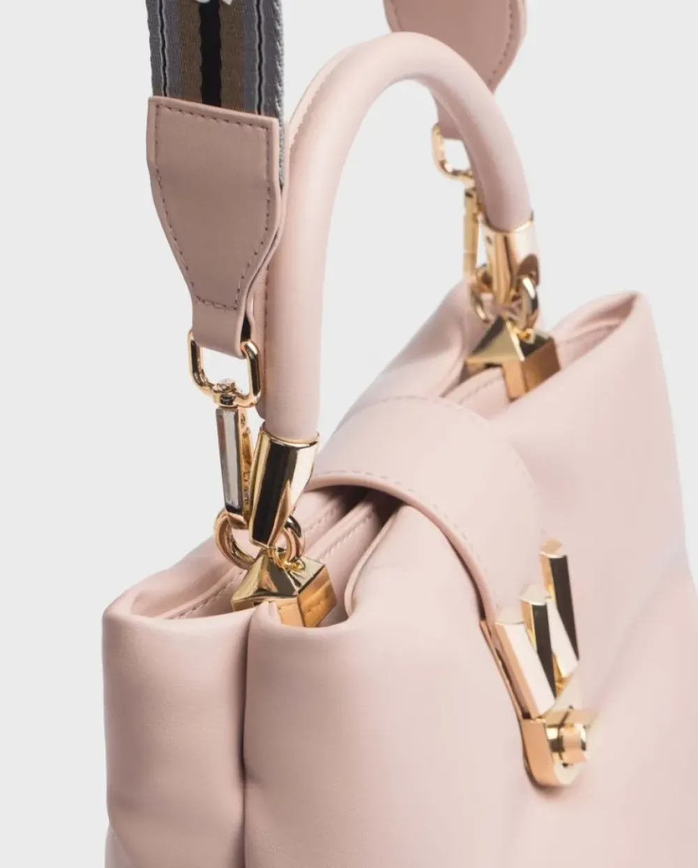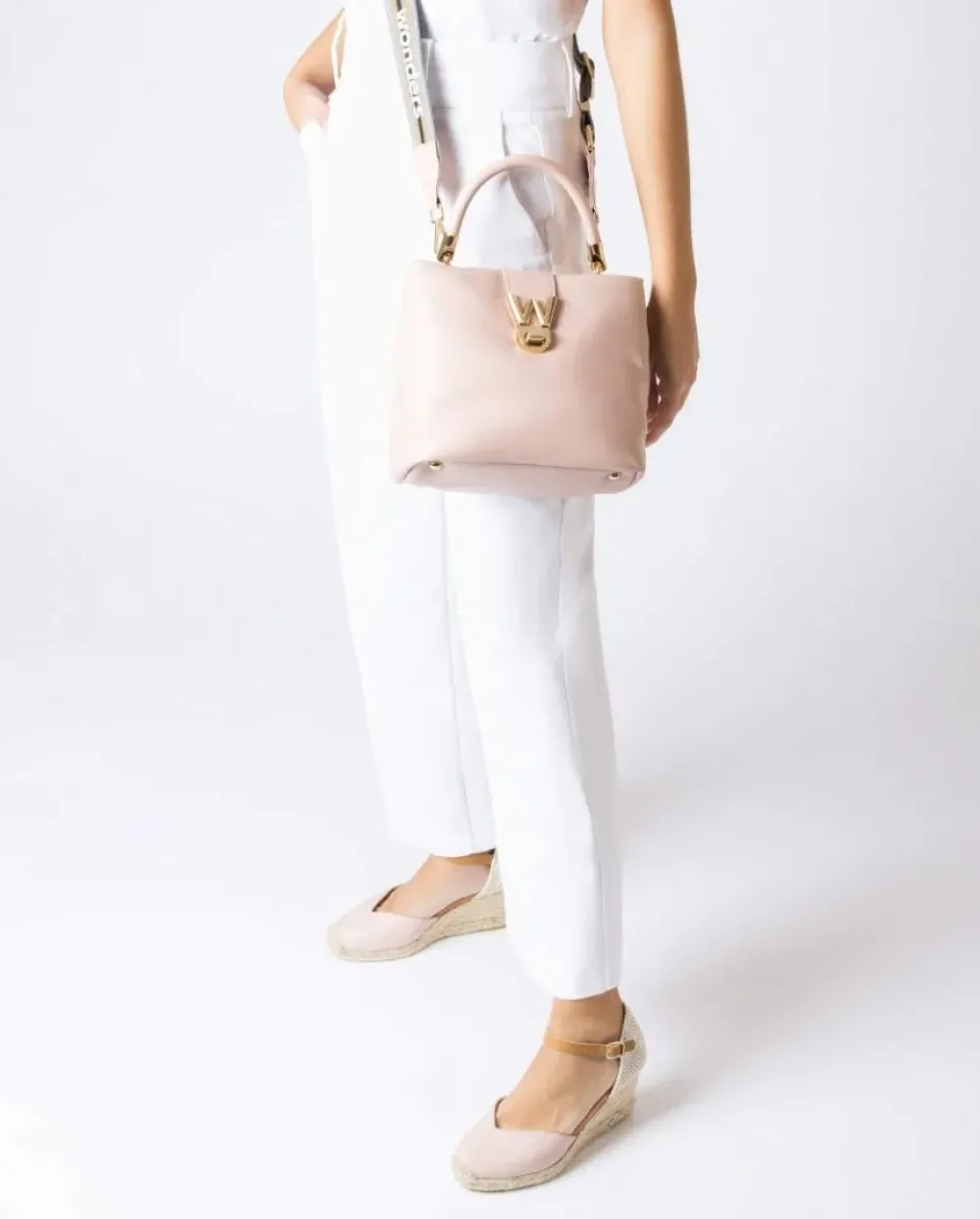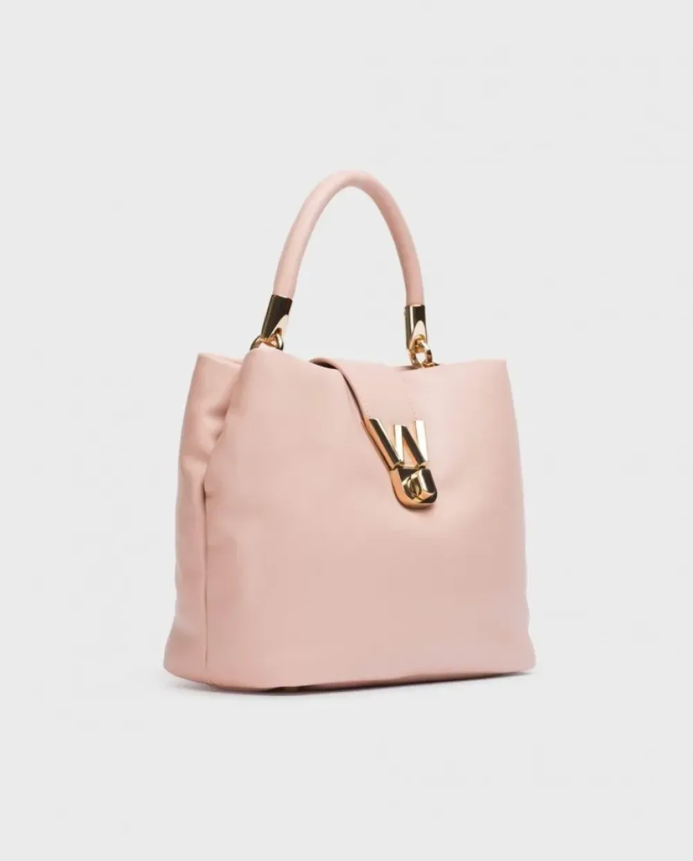Bolso Bandolera De Color Rosa De Tamaño Mediano Con Detalle De Logo Metalizado Color Dorado Y Cierre Giratorio. Modelo De Doble Asa, Una Fija De Mano Y Otra Extraíble Ajustable. El Interior Cuenta Con Dos Compartimentos Con Cierre Mediante Botón Inmantado Y Bolsillo Interno De Cierre Con Cremallera. Tamaño: 23X20X14 Cm.