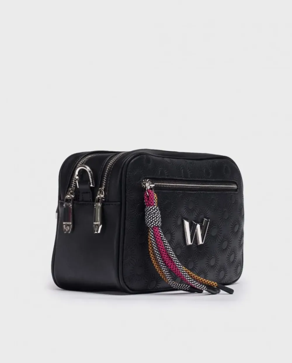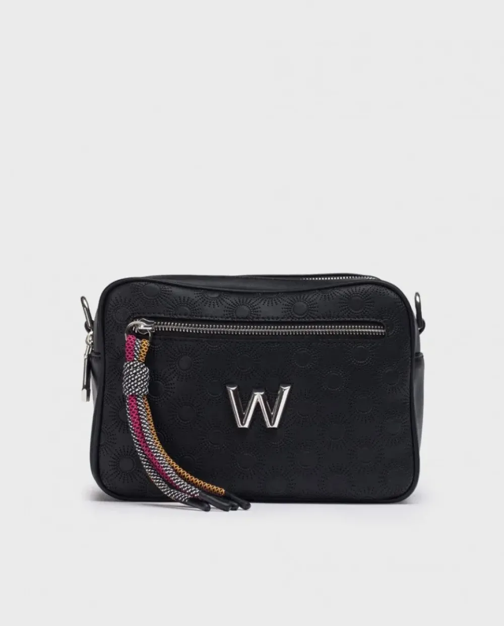 Bolso Bandolera Jade Con Estampado Picado Mujer Color Negro. Tamaño Medio Rectangular Con Doble Compartimento Y Logotipo Metalizado En La Zona Central. Tira Textil Ajustable, Doble Bolsillo Interno Con Cierre De Cremallera En Uno De Ellos Y Serigrafía De Marca. Bolsillo Externo Y Cierre Mediante Cremallera.Medidas: 23X16X10,5 Cm