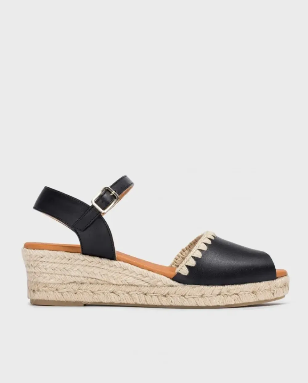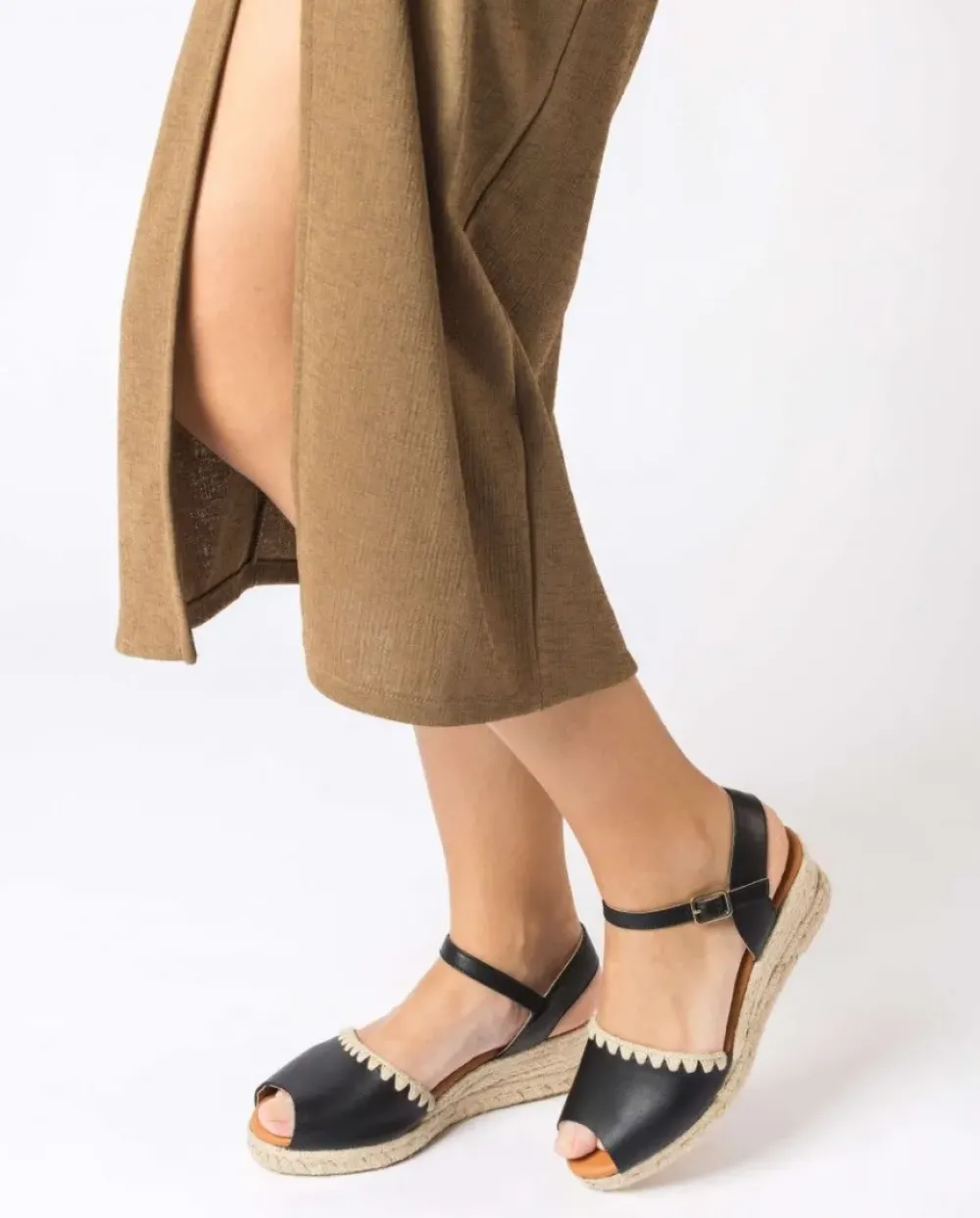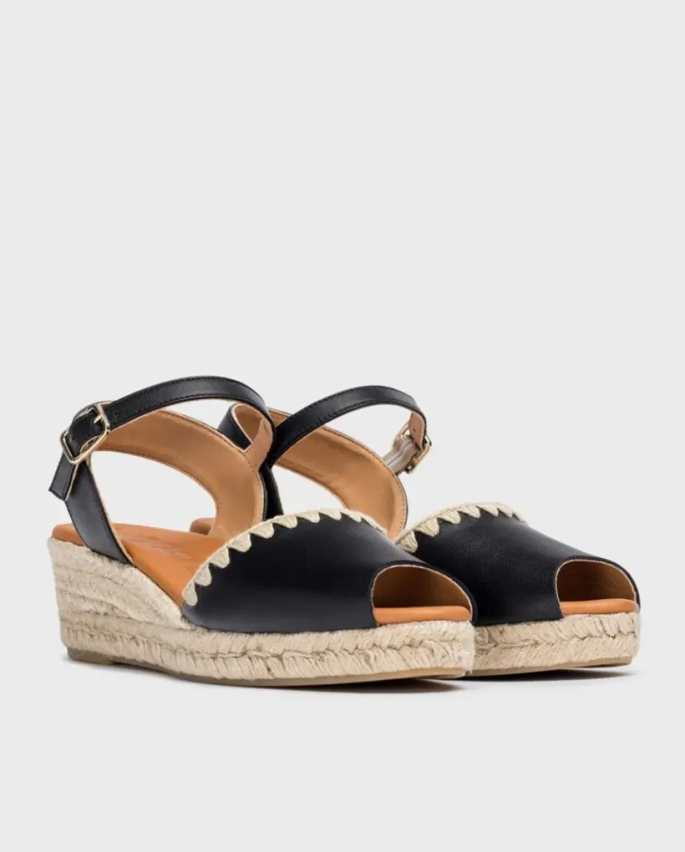 Alpargatas Con Cuña De Yute Trenzado Elaborada En Cuero De Color Negro. Diseño Destalonado Con Una Banda En El Empiene. Cierre De Pulsera Con Hebilla Ajustable. Fabricadas En España Con Materiales Sostenibles, La Fibra De Yute Es 100% Biodegradable Y Reciclable, Inocuo Para El Medio Ambiente. Un Modelo Ideal Para Tus Looks De Verano.