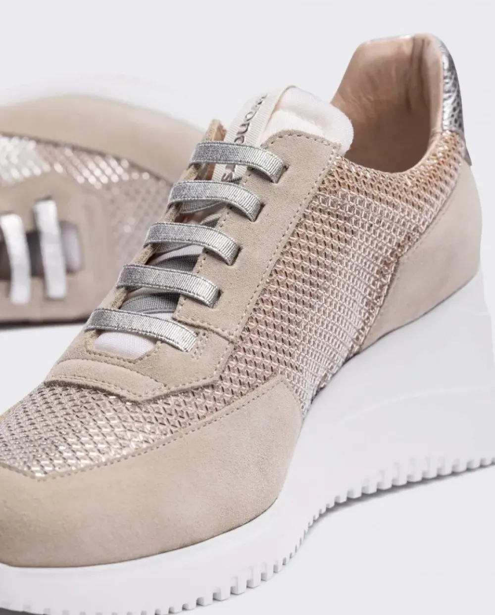 Deportivas Dallas En Color Beige, Con Un Estilo Único Que Combina Diferentes Tipos De Piel. Con Cierre Mediante Cordones Elásticos Que Permite Un Ajuste Perfecto Y Detalle Del Monograma Wonders En El Lateral Que Le Añade Un Toque Distintivo Y Elegante.La Suela Se Alza Sobre Una Cuña Desarrollada Con La Tecnología Wondersfly™, Lo Que Garantiza Una Experiencia Ligera Y Confortable A Cada Paso. Además, Su Plantilla Extraíble Ofrece Un Extra De Comodidad Y Adaptabilidad.