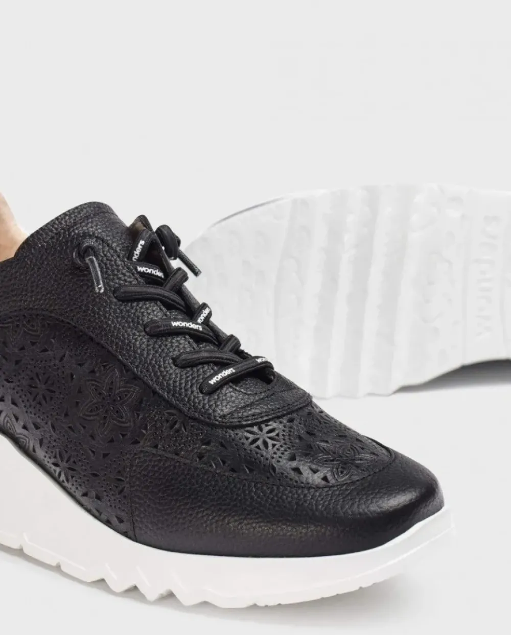 Deportivas De Piel Texturizada En Color Negro. Un Modelo Sport Con Detalle De Perforado Con Dibujo Floral. Parte Trasera Acolchada En Color Plata. Cierre Mediante Cordones Elásticos Logotipados. Suela Dentada Desarrollada Con Tecnología Wondersfly ™ Garantía De Ligereza Y Confort . Prepárate Para La Sensación, Yes We Fly.