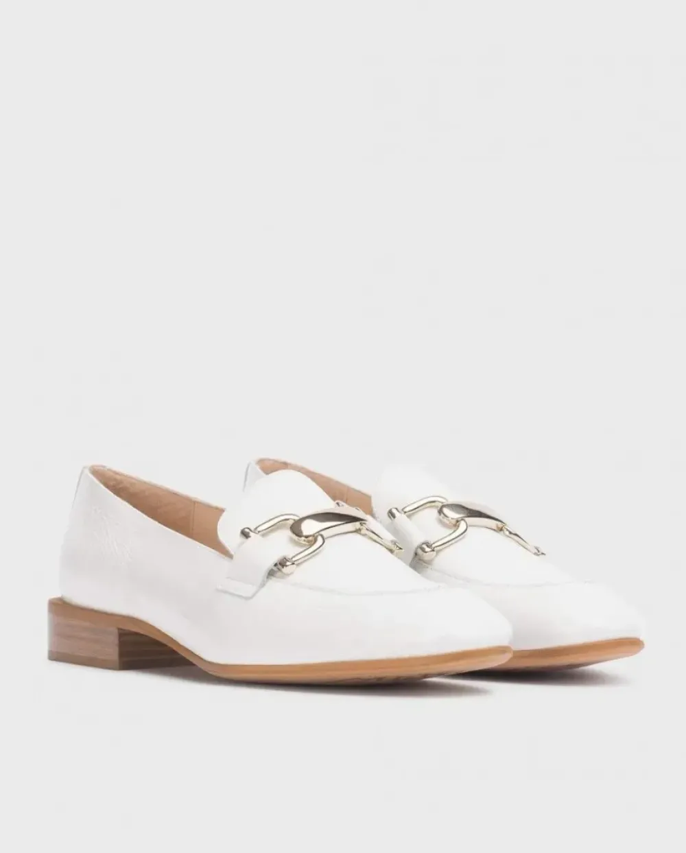 Mocasín Plano Ermes Piel Charol En Color Blanco. Un Modelo Elegante Con Adorno De Eslabón Metalizado En La Solapa, De Punta Redonda Y Tacón Cuadrado Imitación Madera.Suela Logotipada 100% Hecho En España.