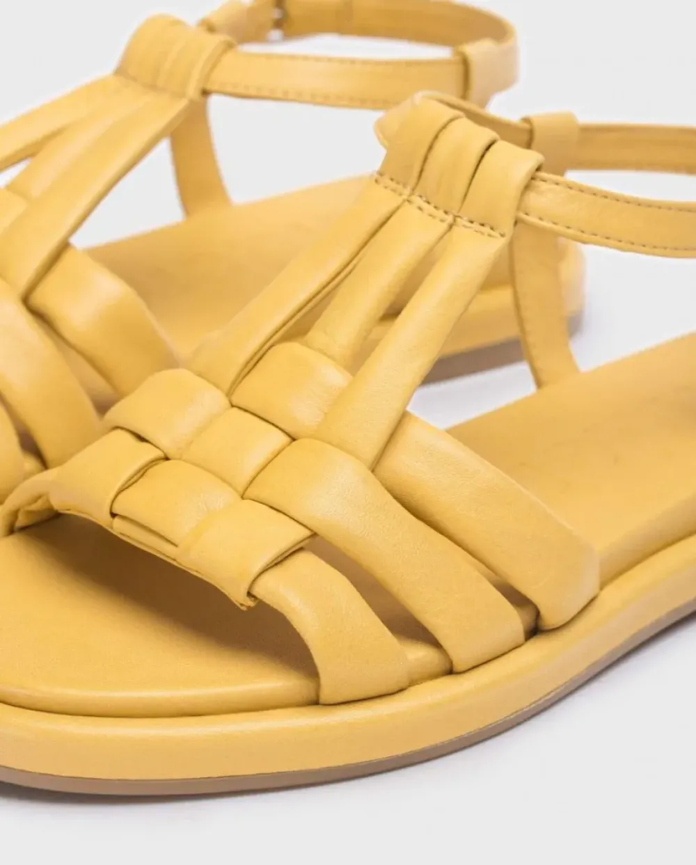 Sandalia Plana Luna De Piel En Color Amarillo. Un Modelo Versátil Con Detalle De Tiras Entrelazadas. Cierre Mediante Tira Con Hebilla Ajustable. Suela Acolchada Que Permite Conseguir Un Calzado Cómodo Y A La Moda.