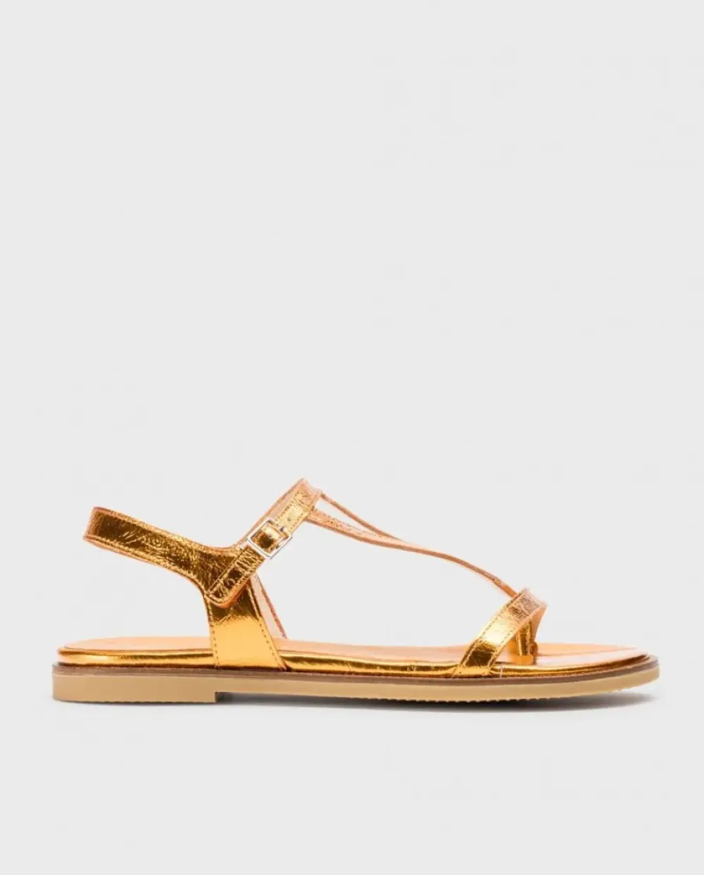 Sandalias Plana En Piel Metalizada Arrugada Naranja. El Modelo Jimena Versátil, Tiene Punta Redonda, Multi Tiras Y Una Sujección Perfecta Gracias A Una Hebilla Que Rodea El Tobillo . Disfruta De Comodidad Garantizada Gracias A La Plantilla Memorygel. ¡Consigue Los Tuyos Y Camina Con Estilo Y Confort En Cada Paso!