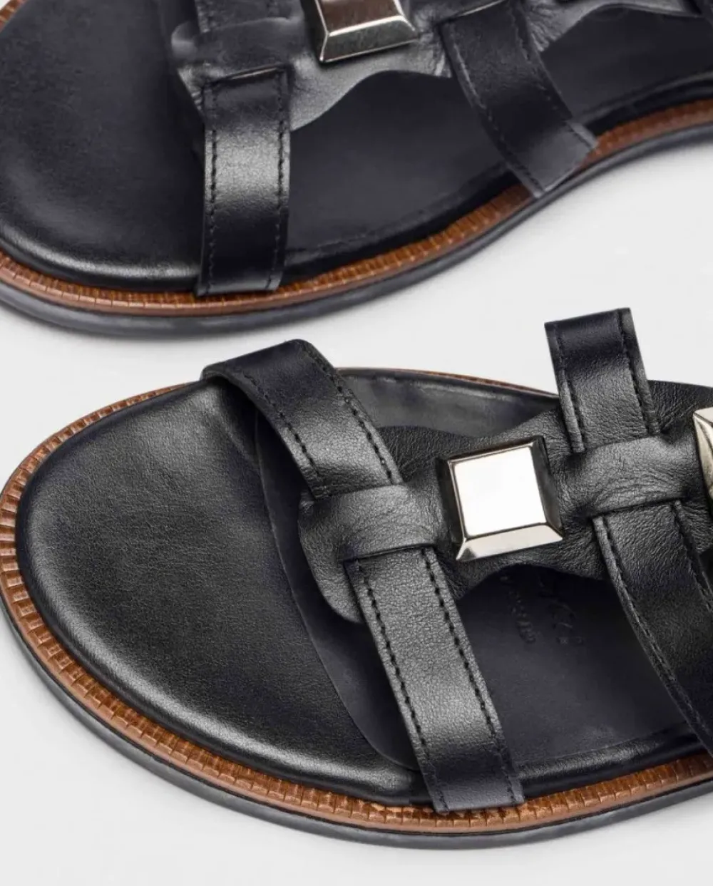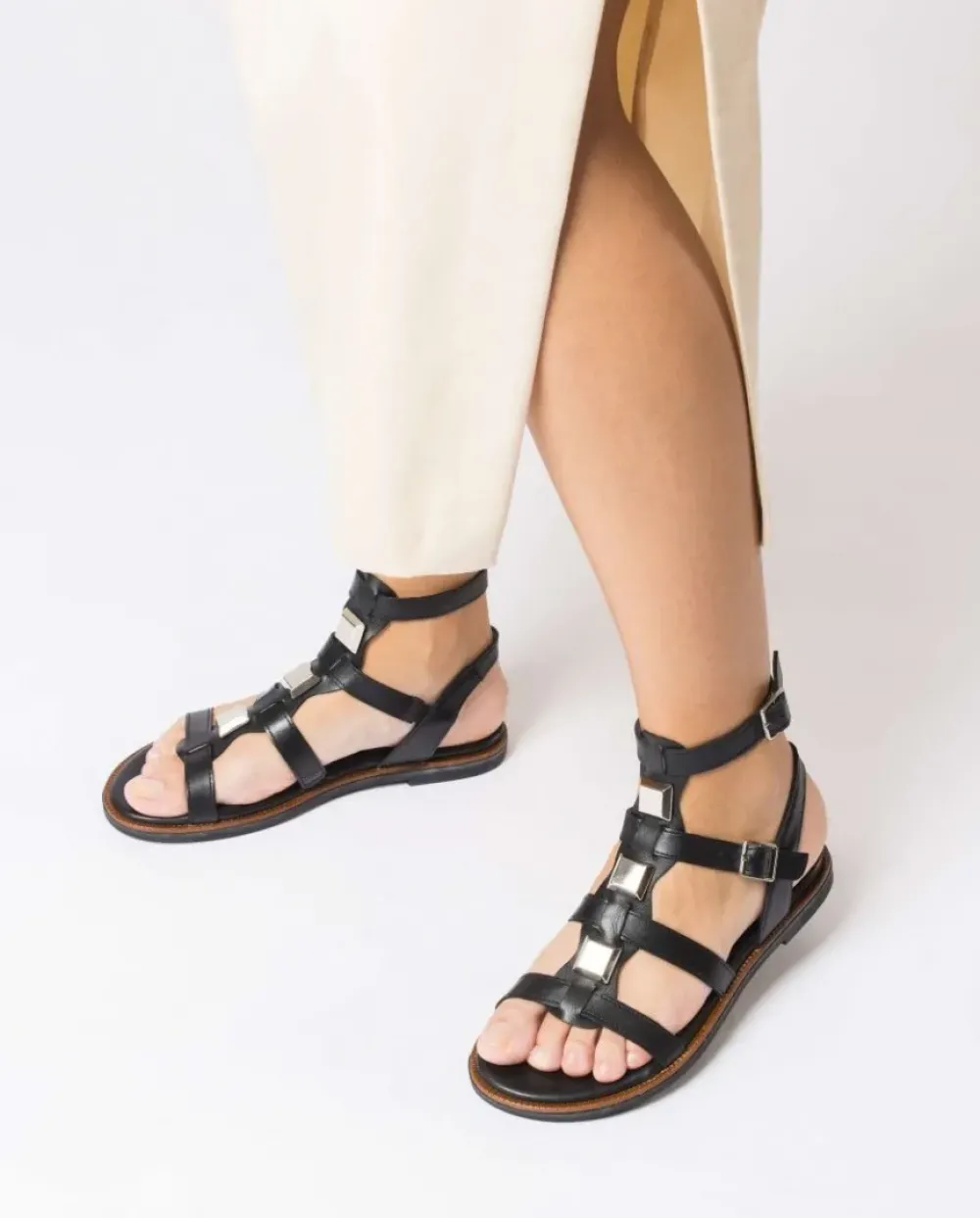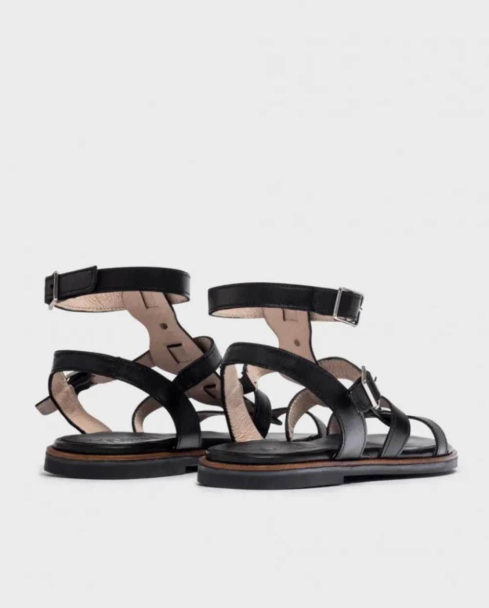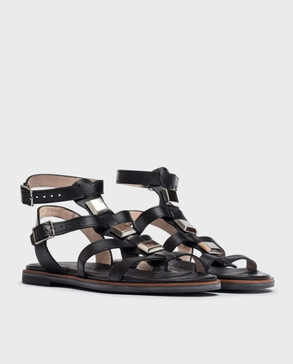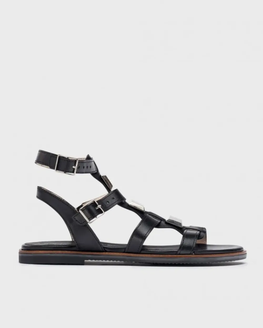 Sandalias Planas En Piel Lisa En Negro. El Modelo Olimpia Es Un Contemporáneo Con Multi Tiras Y Detalles Metalizados Geométrcos Y Una Sujección Perfecta Gracias A Una Hebilla Que Rodea El Tobillo. Disfruta De Comodidad Garantizada Gracias A La Plantilla Memorygel. ¡Consigue Los Tuyos Y Camina Con Estilo Y Confort En Cada Paso!